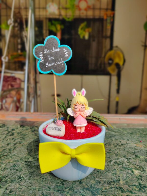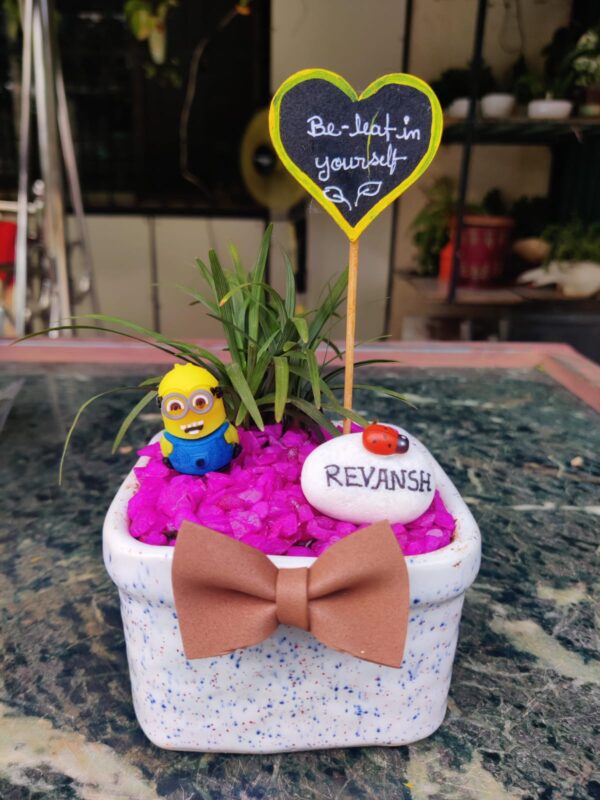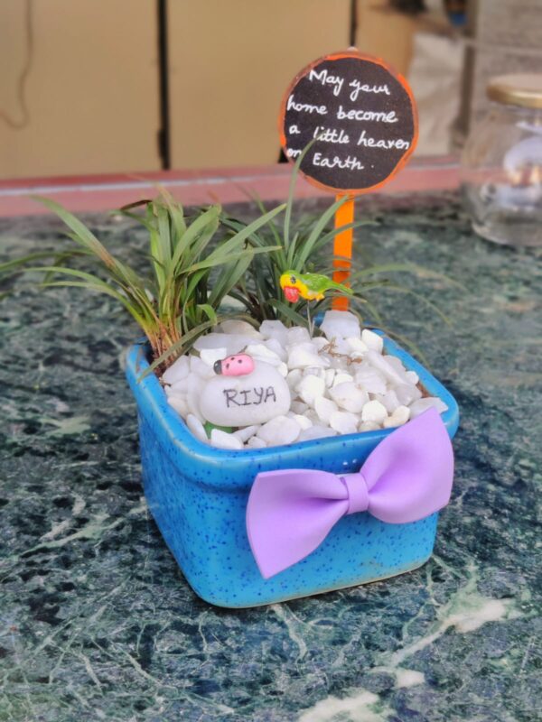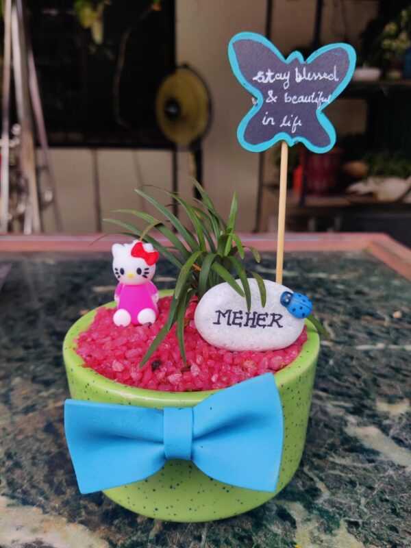 - Stone with kid’s name and ladybug toy, board with quote & bow