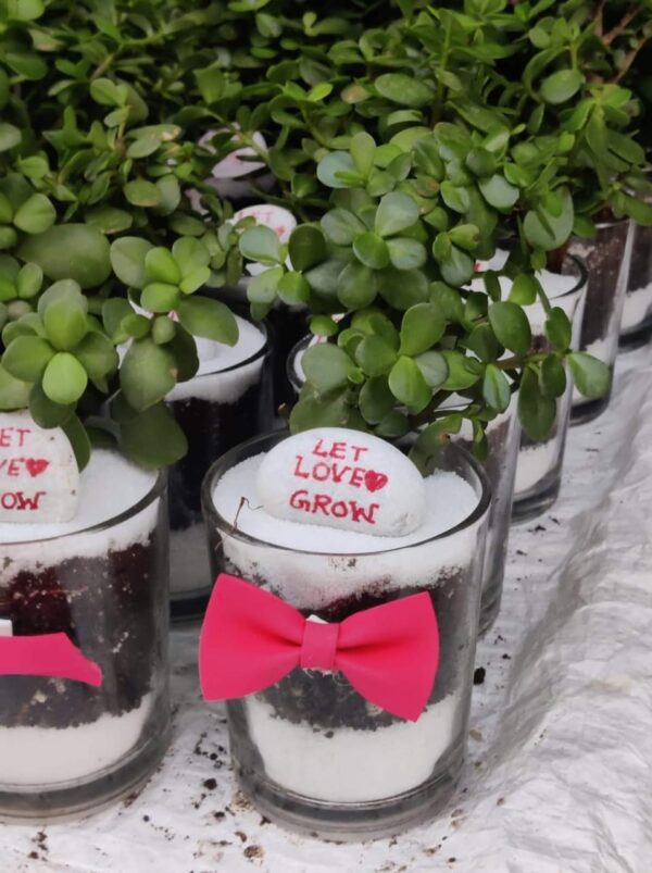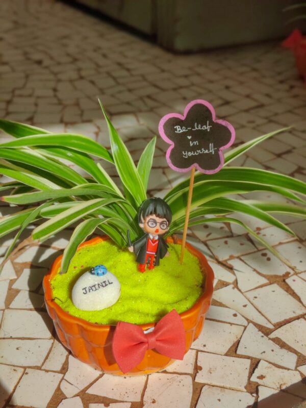 - Stone with kid’s name and ladybug toy, board with quote & bow